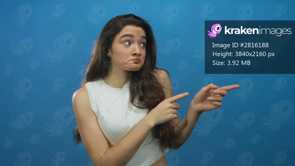 Woman pointing finger to object in blue studio setting with long hair and wearing white crop top; uncertainty.