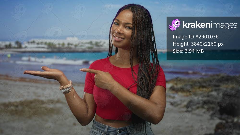 Woman pointing finger to open palm on beach wearing red crop top and bracelets, smiling and looking at hand; playful invitation.