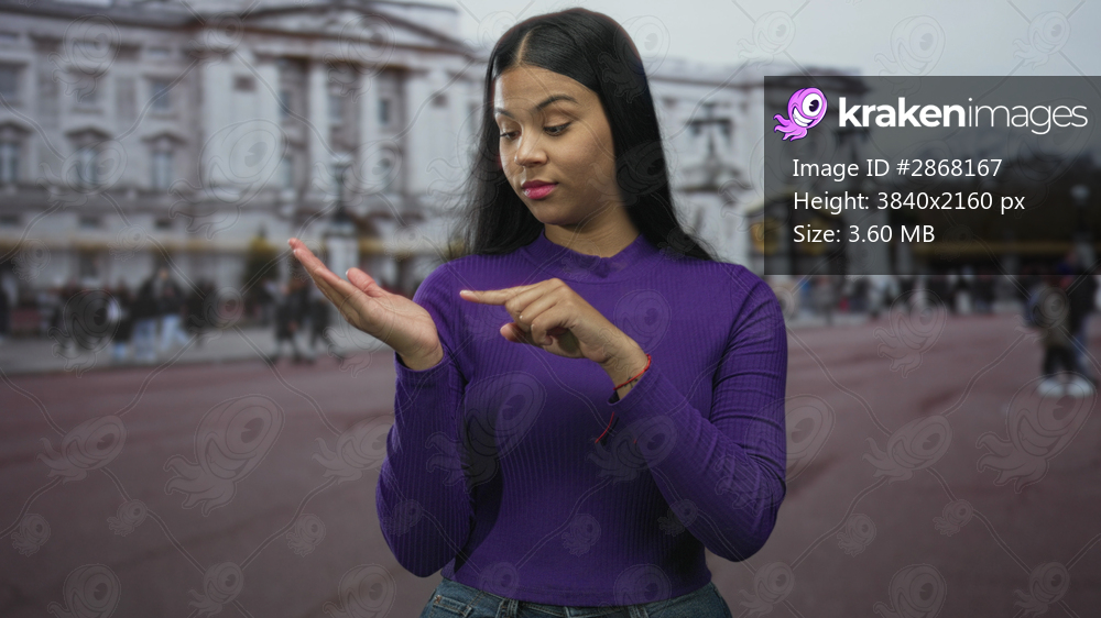 Woman pointing finger to open palm on busy urban street in front of ornate building; curiosity explanation demonstration exploration.