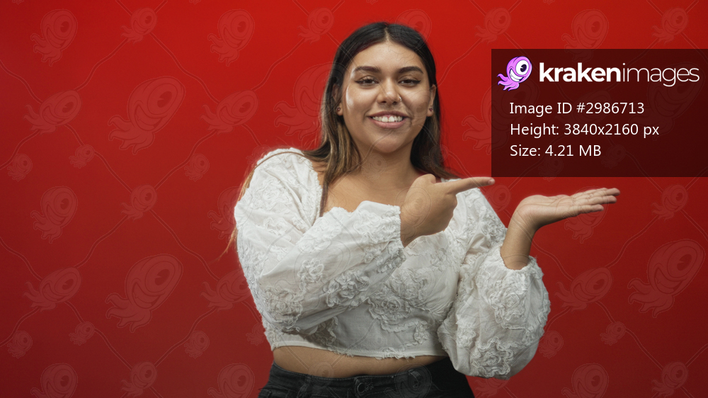 Woman pointing finger to open palm while smiling with eyes closed in red studio wearing white lace blouse and black jeans; playful confidence.
