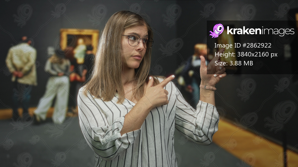 Woman pointing finger to painting while viewing artwork in building; curiosity art appreciation exploration.