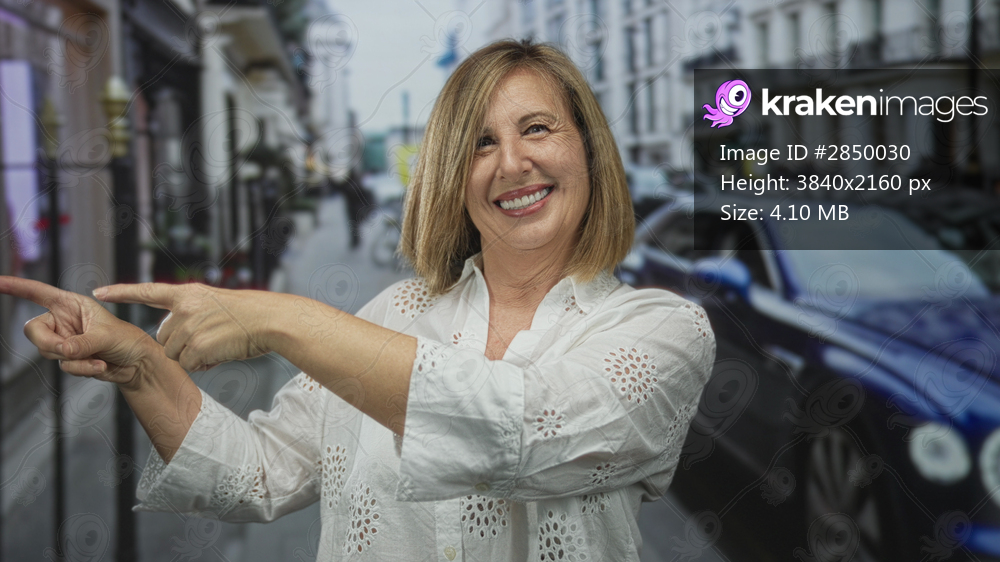 Woman pointing finger to parked car in front of a building on a bustling street as she smiles broadly; happiness.