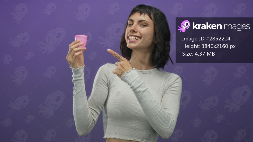 Woman pointing finger to pink menstrual cup in purple studio setting; sustainability comfort confidence.