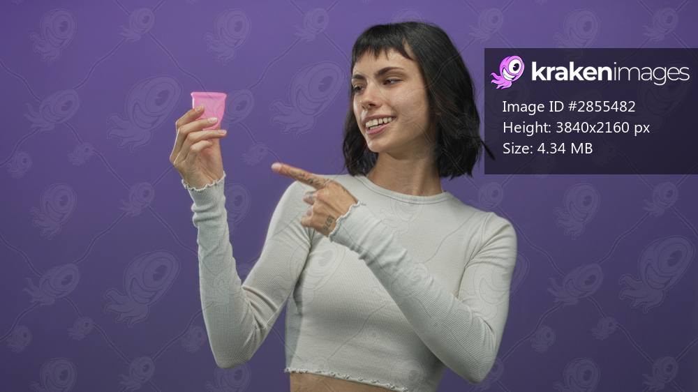 Woman pointing finger to pink menstrual cup in purple studio setting; sustainability comfort confidence.