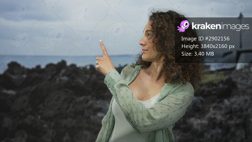 Woman pointing finger to sky at rocky beach by the sea, wearing white camisole and sheer green shirt; calm contemplation.