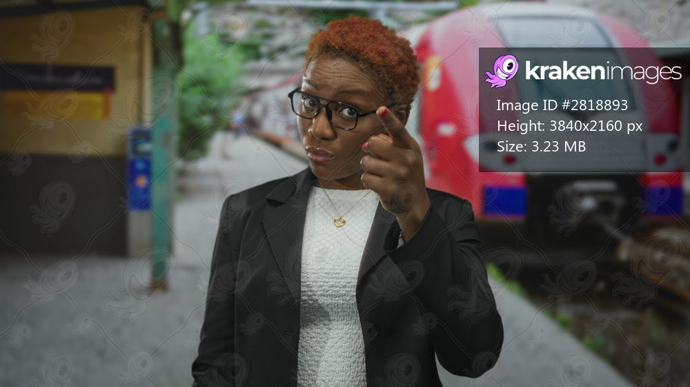 Woman pointing finger to temple beside a stationary train on street while wearing a black blazer and glasses; curiosity.