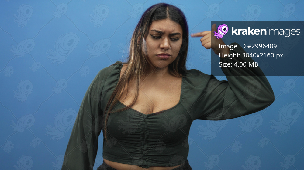 Woman pointing finger to temple with furrowed brow, cropped green top and nose ring in studio blue backdrop; frustration.