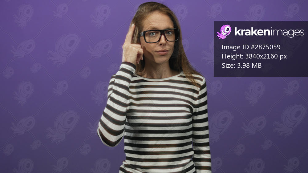 Woman pointing finger to temple and pointing at camera in studio with purple backdrop wearing striped top and black glasses; thinking focus.
