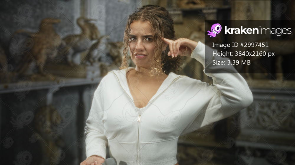 Woman pointing finger to temple while holding a dumbbell in museum building; thinking pondering confusion.