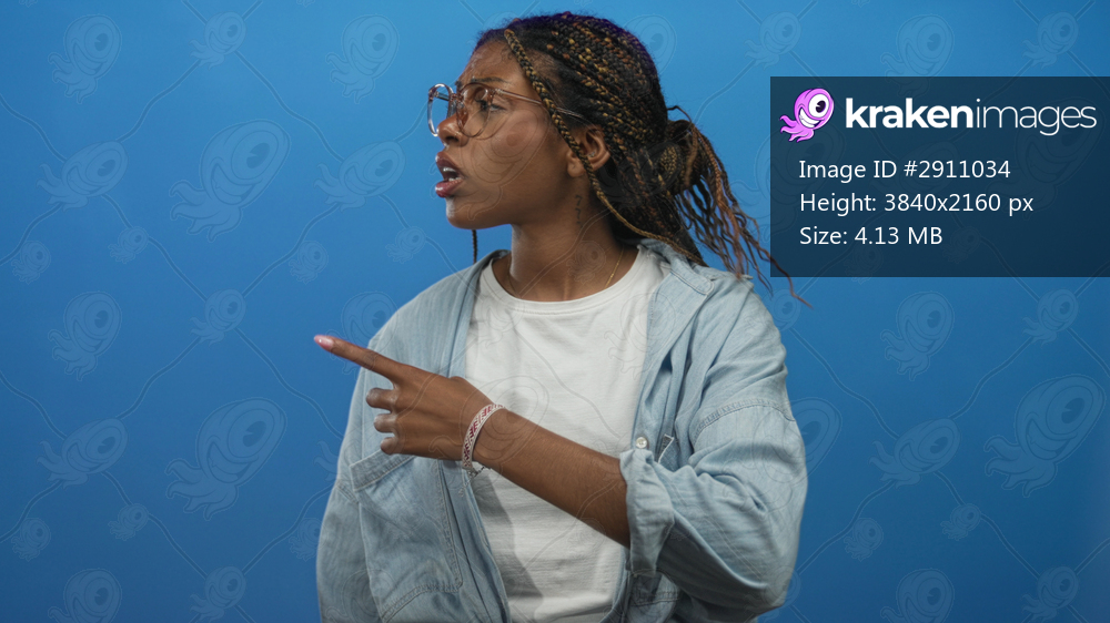 Woman pointing finger to the left in studio with blue backdrop, visible index finger and glasses, denim shirt and braided hair; disapproval.