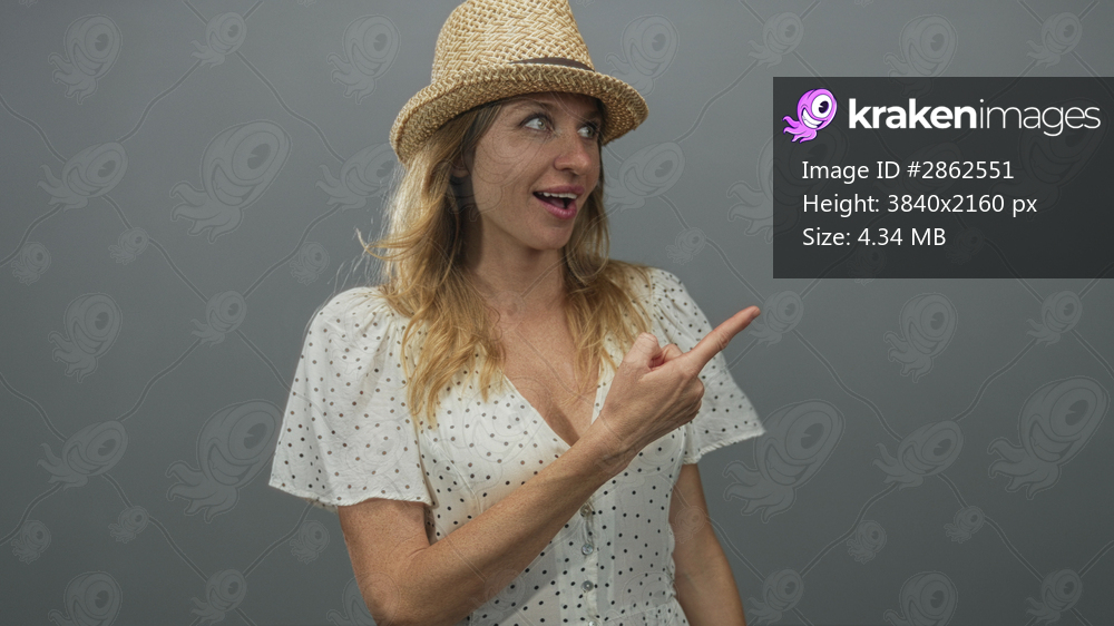 Woman pointing finger to the right in studio against a gray wall, wearing straw hat and white polka dot dress; surprise.