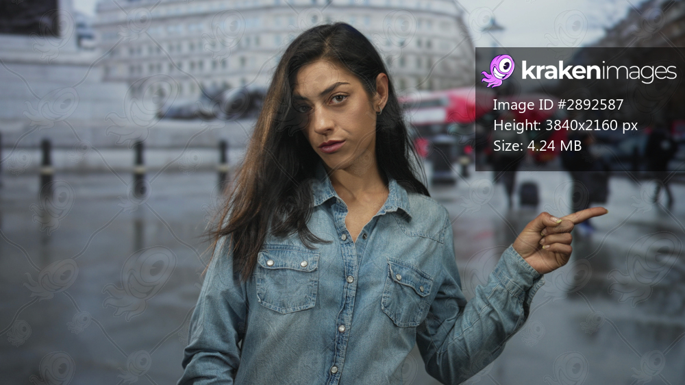 Woman pointing finger to the right on a wet city street near a doubledecker and stone building; subtle skepticism.