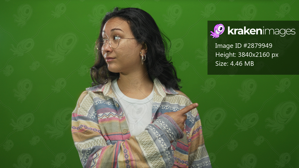 Woman pointing finger to the right wearing glasses and a patterned jacket in studio with vivid green backdrop; curiosity choice direction.