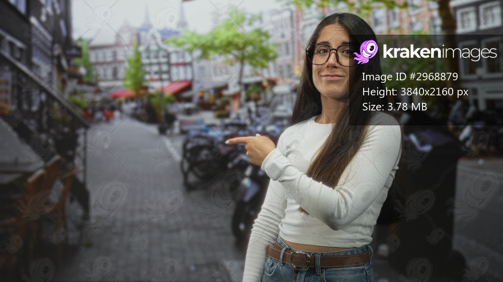 Woman pointing finger to the side on a bustling street with parked scooters and a trashcan, wearing glasses, jeans and belt; playful curiosity.