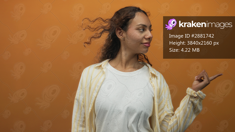 Woman pointing finger to the side wearing white t shirt and striped overshirt in a studio with orange backdrop; confidence self expression.