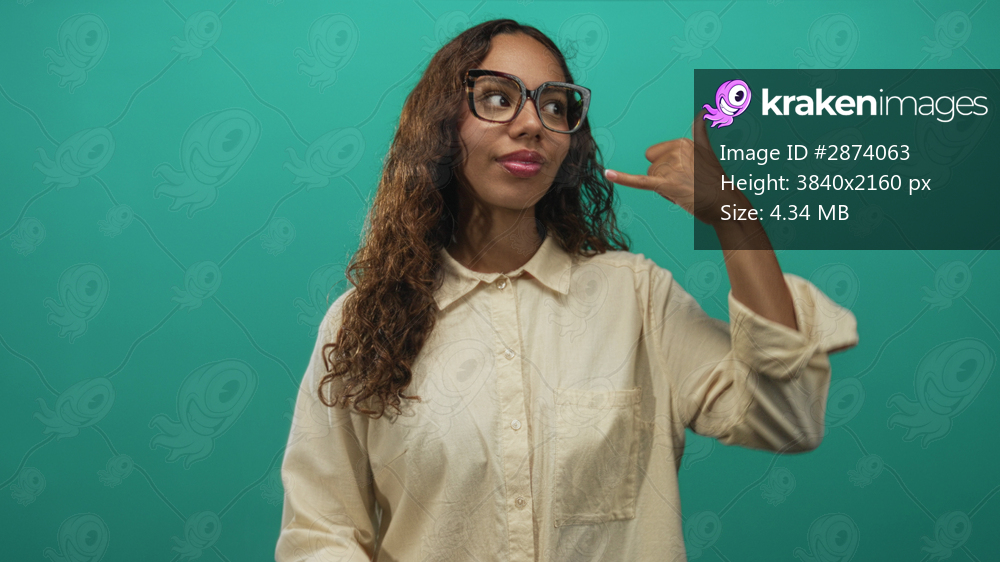 Woman pointing finger to thumb in teal studio while making a phone shaka gesture and wearing large glasses and beige shirt; playful curiosity.