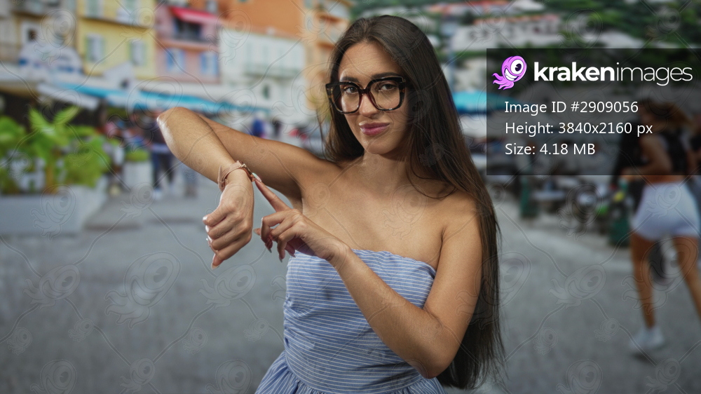 Woman pointing finger to watch on wrist in street plaza with blurred crowd; time urgency impatience.