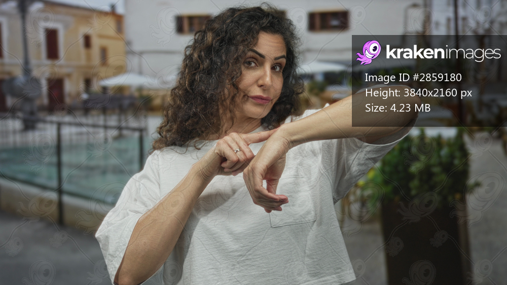 Woman pointing finger to wrist in white shirt near sunlit sidewalk cafe on busy city street outdoors; impatience.