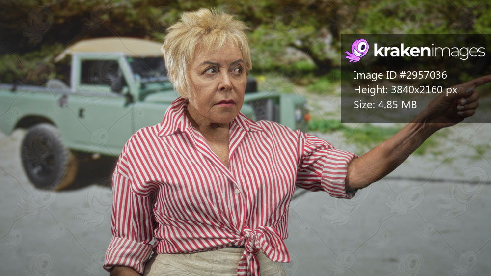 Woman pointing finger toward a parked green vehicle on street, striped shirt tied at waist; firm concern.