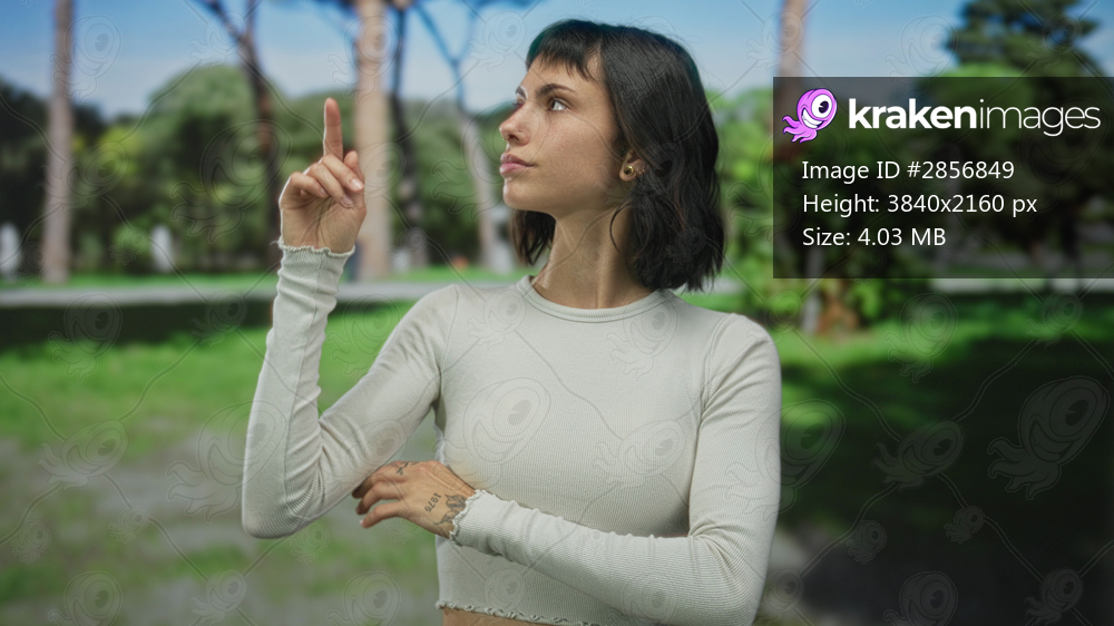 Woman pointing finger toward an unseen spot beyond the frame through a sunlit forest clearing; curiosity.