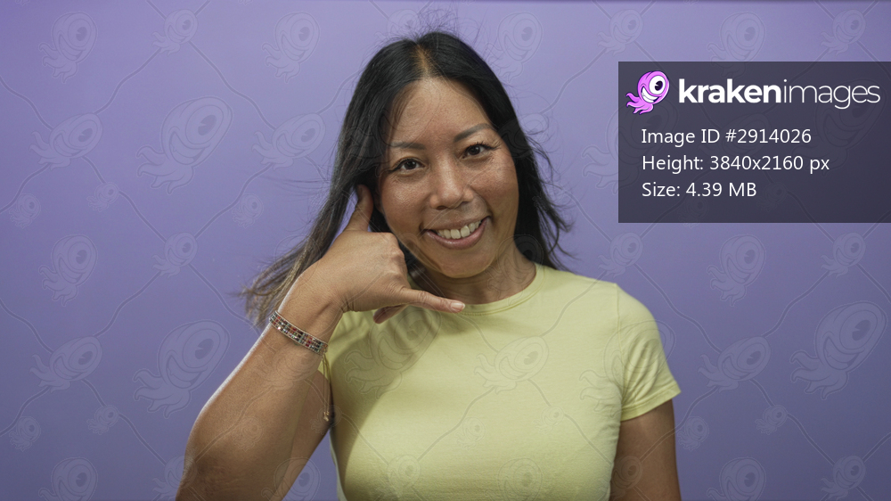 Woman pointing finger toward camera with hand gesture and hair twirl in studio with purple wall; friendly confidence.