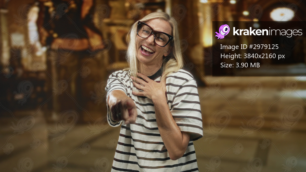 Woman pointing finger toward camera, hand on chest and laughing in a historic building corridor; playful joy.
