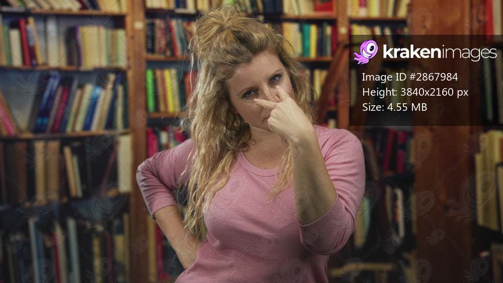Woman pointing finger toward camera with hand on hip and leaning slightly forward in building amid bookshelves; defiance.