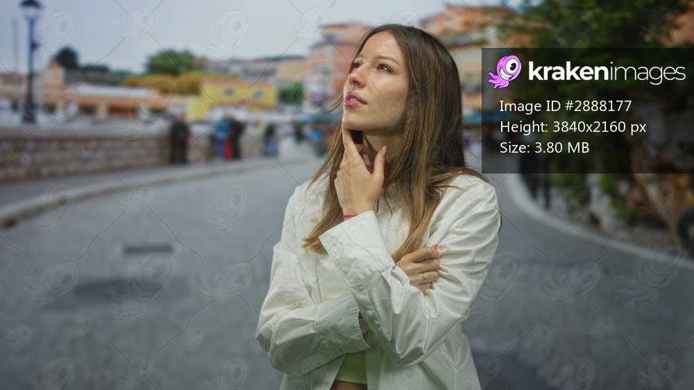 Woman pointing finger toward camera on street wearing white shirt and crossed arms; thoughtful reflection.