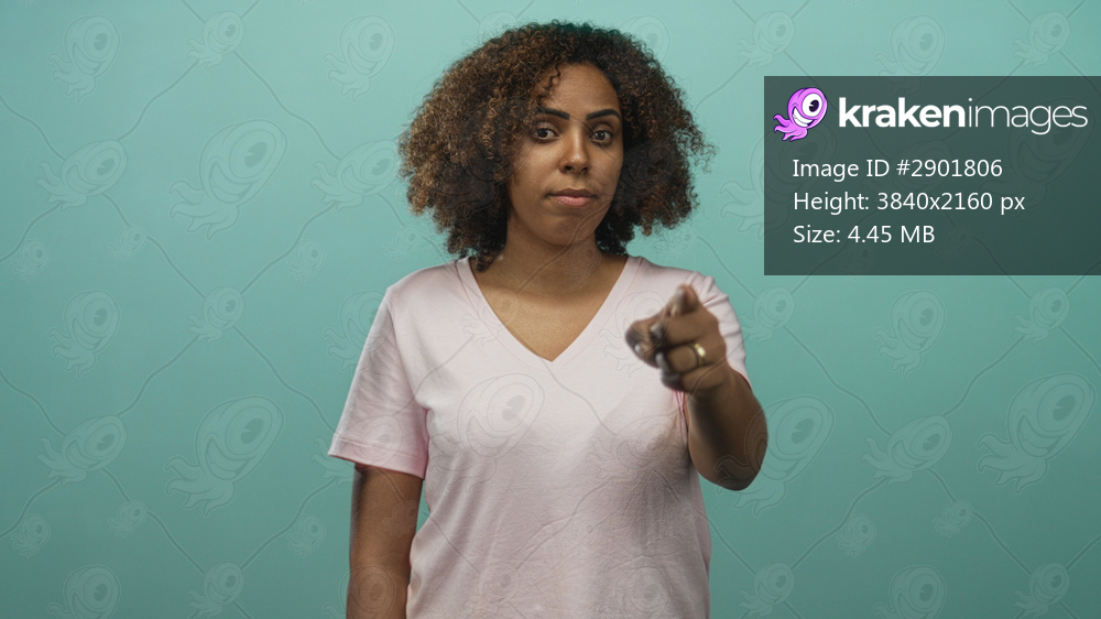 Woman pointing finger toward camera and touching temple in teal studio wearing pink v neck shirt; confidence.