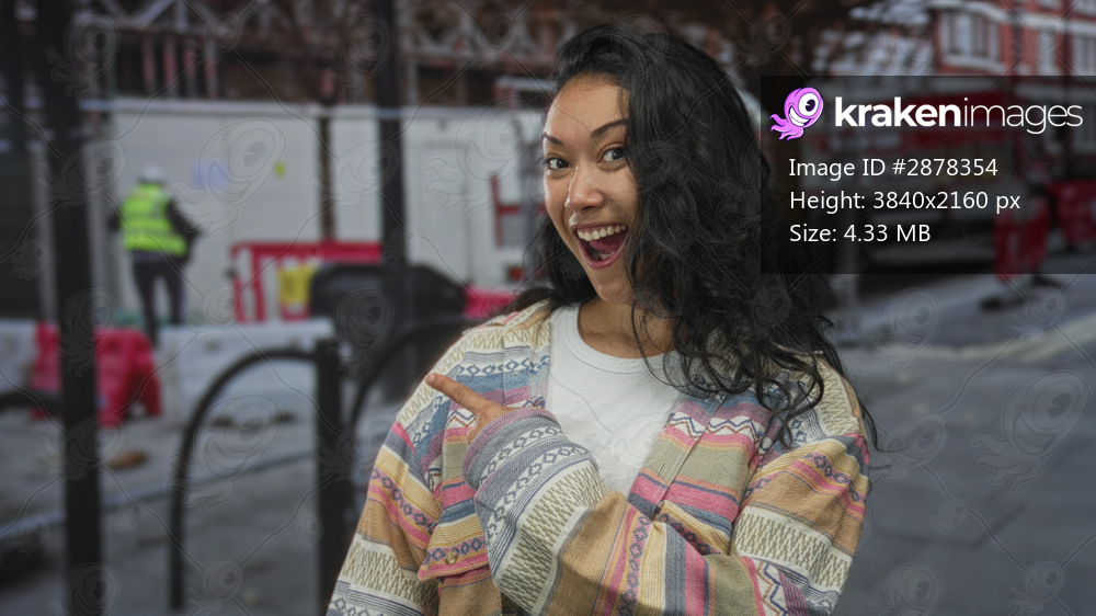 Woman pointing finger toward scaffolding at construction site on street, smiling directly at camera; joy.