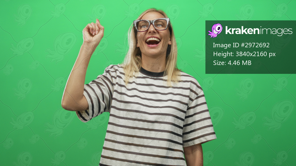 Woman pointing finger upward in green screen studio while smiling, wearing glasses and a striped tshirt; joyful inspiration.