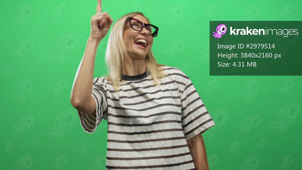 Woman pointing finger upward in green screen studio while smiling, wearing glasses and a striped tshirt; joyful inspiration.