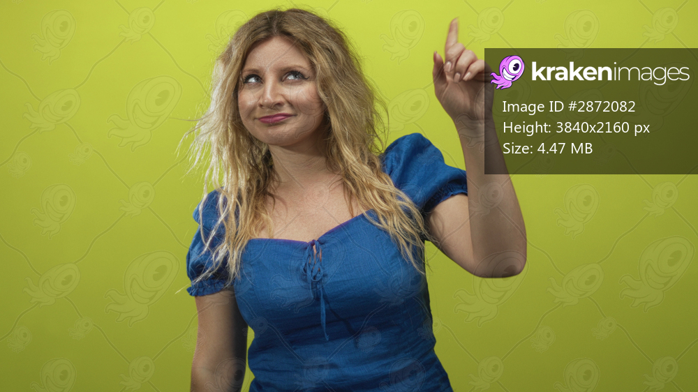 Woman pointing finger upward in studio against lime green backdrop, wearing blue dress and tousled blonde hair; curiosity idea discovery.