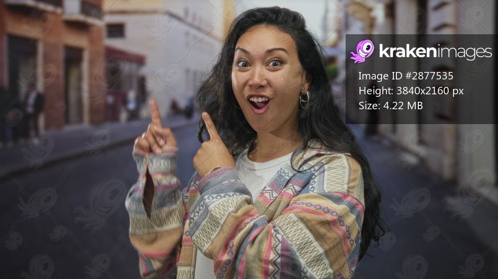 Woman pointing finger upward on street with open mouth and visible fingers wearing patterned jacket, mid gesture and smiling; playful curiosity surprise. - Kraken Images