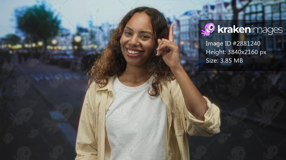 Woman pointing finger upward on street, smiling broadly in a white tshirt and open shirt with visible necklace; happiness connection energy.