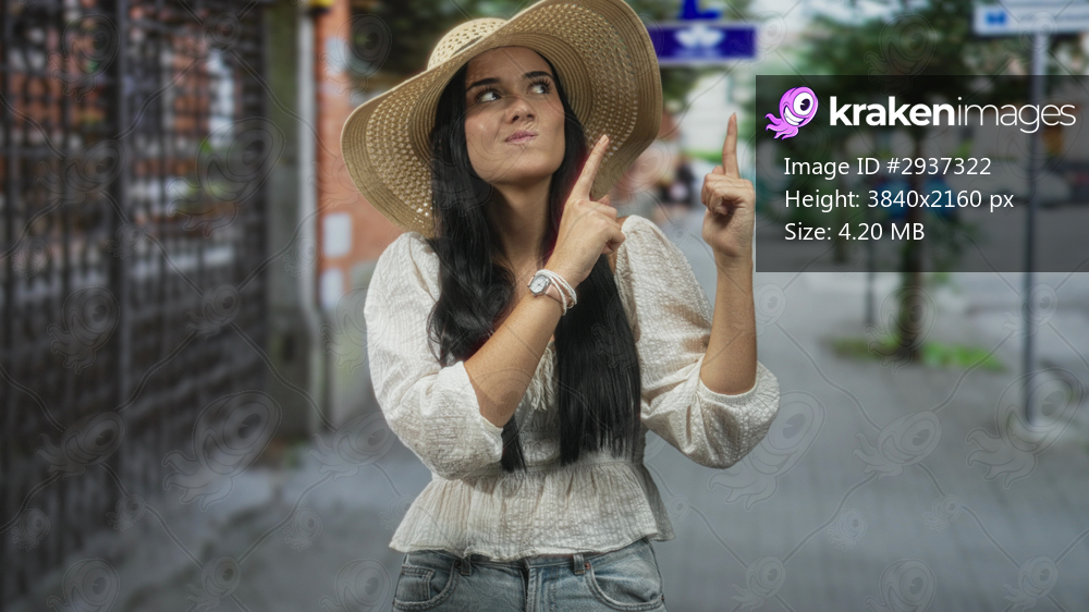 Woman pointing finger upward on street wearing sunhat and white blouse, smiling and looking up at a street sign; playfulness curiosity.