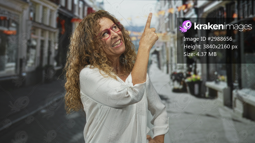 Woman pointing finger upward and smiling with red glasses and white blouse on a street; joy confidence.