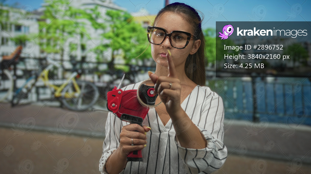 Woman pointing finger while holding a tape dispenser on a busy amsterdam street near canal railing and bicycles; determination task efficiency.