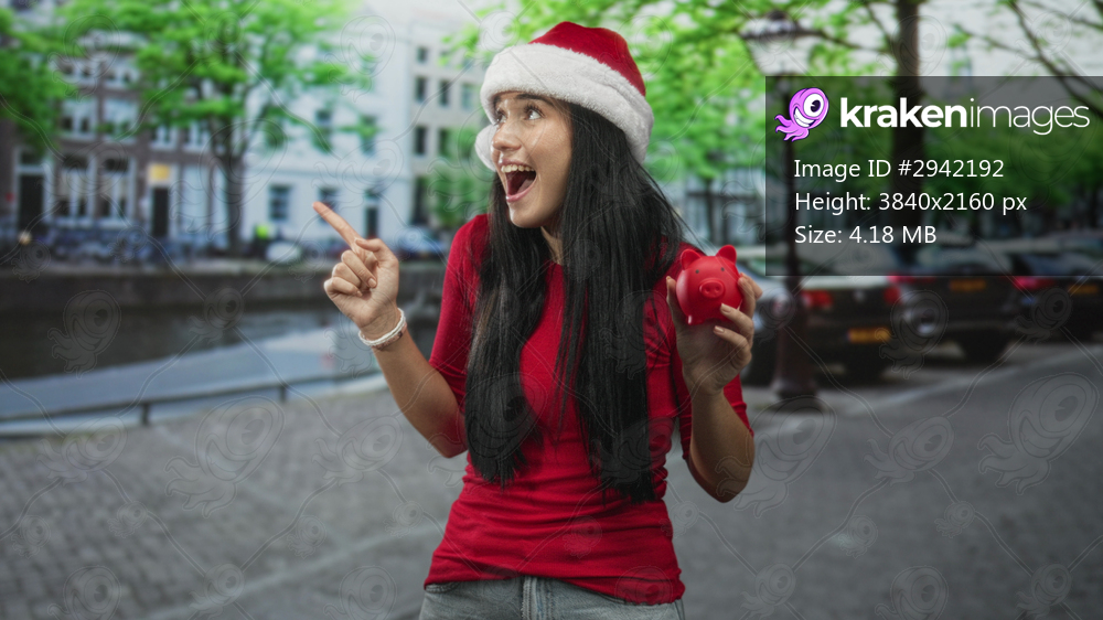 Woman pointing finger while holding piggybank and wearing santa hat on a street by a canal with parked cars and lampposts; cheerful savings spirit.