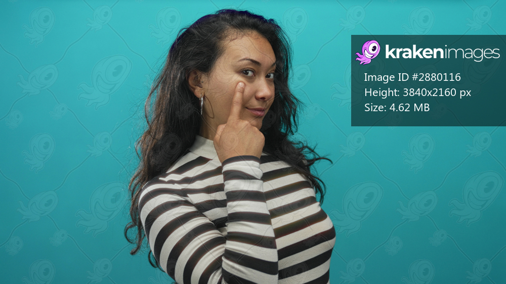 Woman pointing finger while wearing black and white striped top and hoop earring in teal studio; confidence.