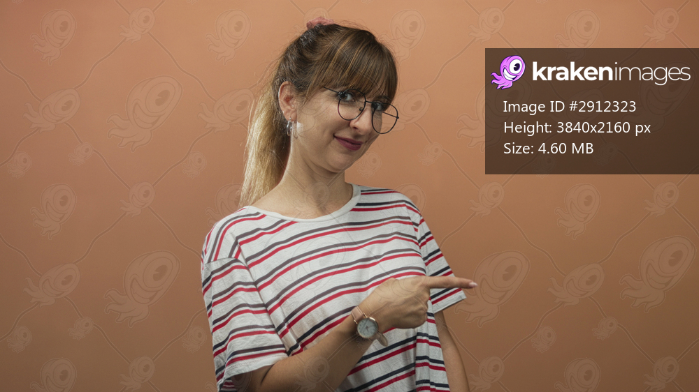 Woman pointing finger with wristwatch, wearing glasses and striped shirt in studio against peach wall; playfulness casual charm.