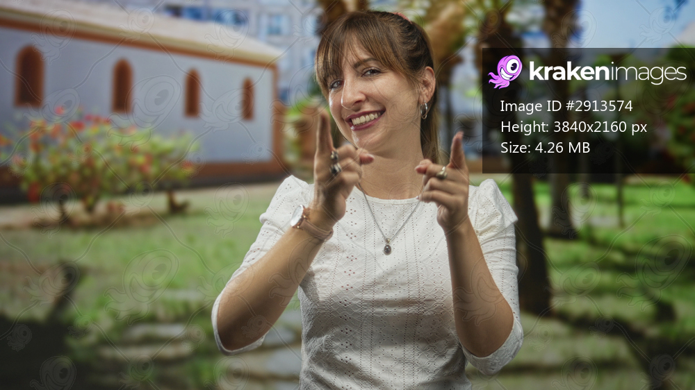 Woman pointing fingers at camera in sunny park with palm trees, green lawn and stone path while smiling and wearing white eyelet top; playful invitation. - Kraken Images