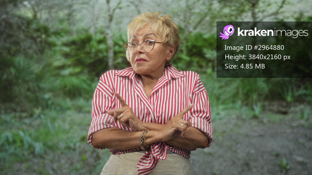 Woman pointing fingers with both hands in a forest, wearing a red striped tied shirt and glasses; playful defiance.