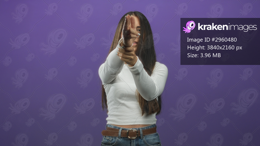 Woman pointing fingers like a pistol, hands clasped and aiming with furrowed brow, white long sleeve top and jeans visible on purple studio set; focus. - Kraken Images