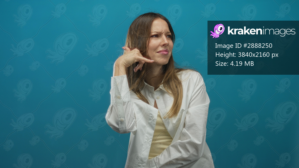 Woman pointing fingers and making phone gesture with hands while wearing white shirt in teal studio; playful curiosity.