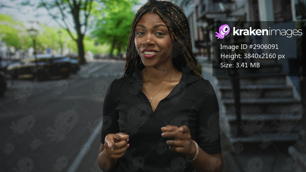 Woman pointing fingers on a city street, smiling with braided hair and cross necklace while wearing a black top; playful confidence.