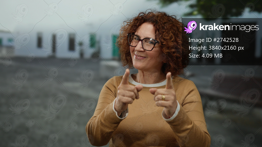 Woman pointing fingers on a city street, wearing glasses and a casual sweater, with curly hair and a confident smile, indicating an interactive and engaging scene outdoors. - Kraken Images