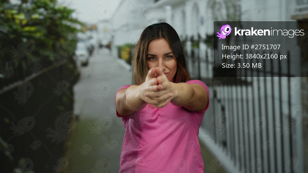 Woman pointing fingers playfully like a gun on an urban street, wearing a pink shirt, expressing confidence and creativity in an outdoor city environment. - Kraken Images