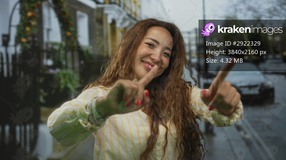 Woman pointing fingers with red nails on a city street, smiling and leaning forward; joyful playful energy.