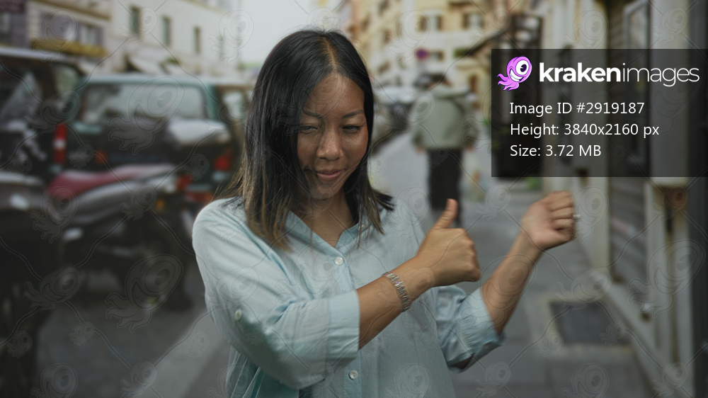 Woman pointing fingers and showing thumb up on narrow city street with parked scooters and cars; playful confidence.